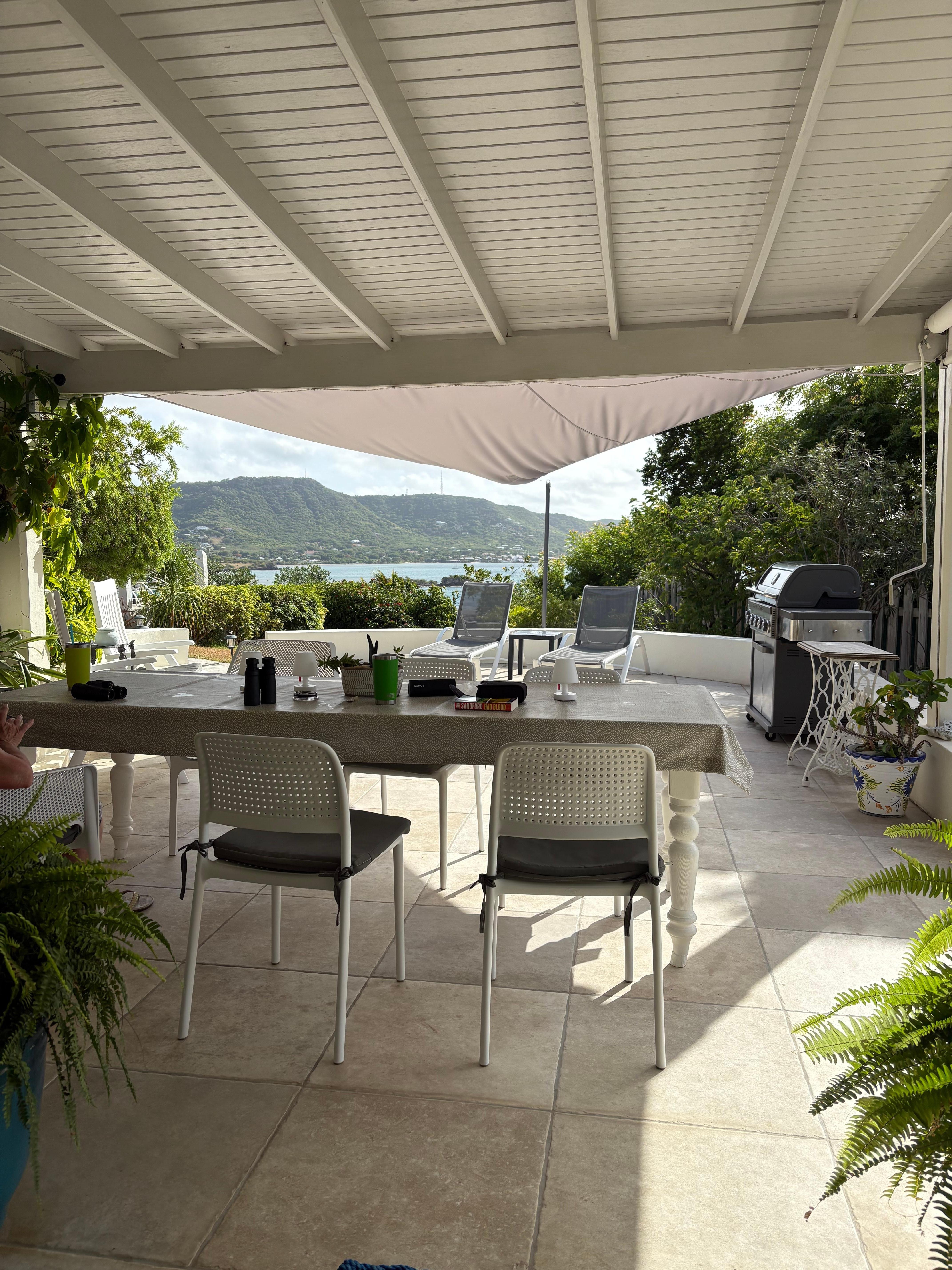 Un enorme, con gradas Veranda alberga una zona de descanso al aire libre y comedor, con capacidad para 8 a 10 ... perfecto para disfrutar de los vientos alisios isla de refrigeración. Una barbacoa de gas está disponible para su uso.