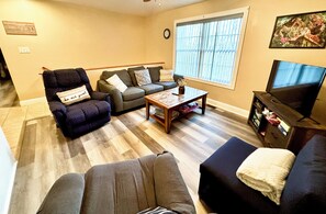 Our 1,000-square-foot house is charming, cozy, and inviting. The living spaces feature brand-new LVP flooring, enhancing an open and airy feel. The spacious living room and eat-in kitchen seamlessly connect, filled with an abundance of natural light. Both the living room and master bedroom are equipped with smart TVs, offering access to popular streaming services such as Netflix, Hulu, and Disney+, as well as various other apps.