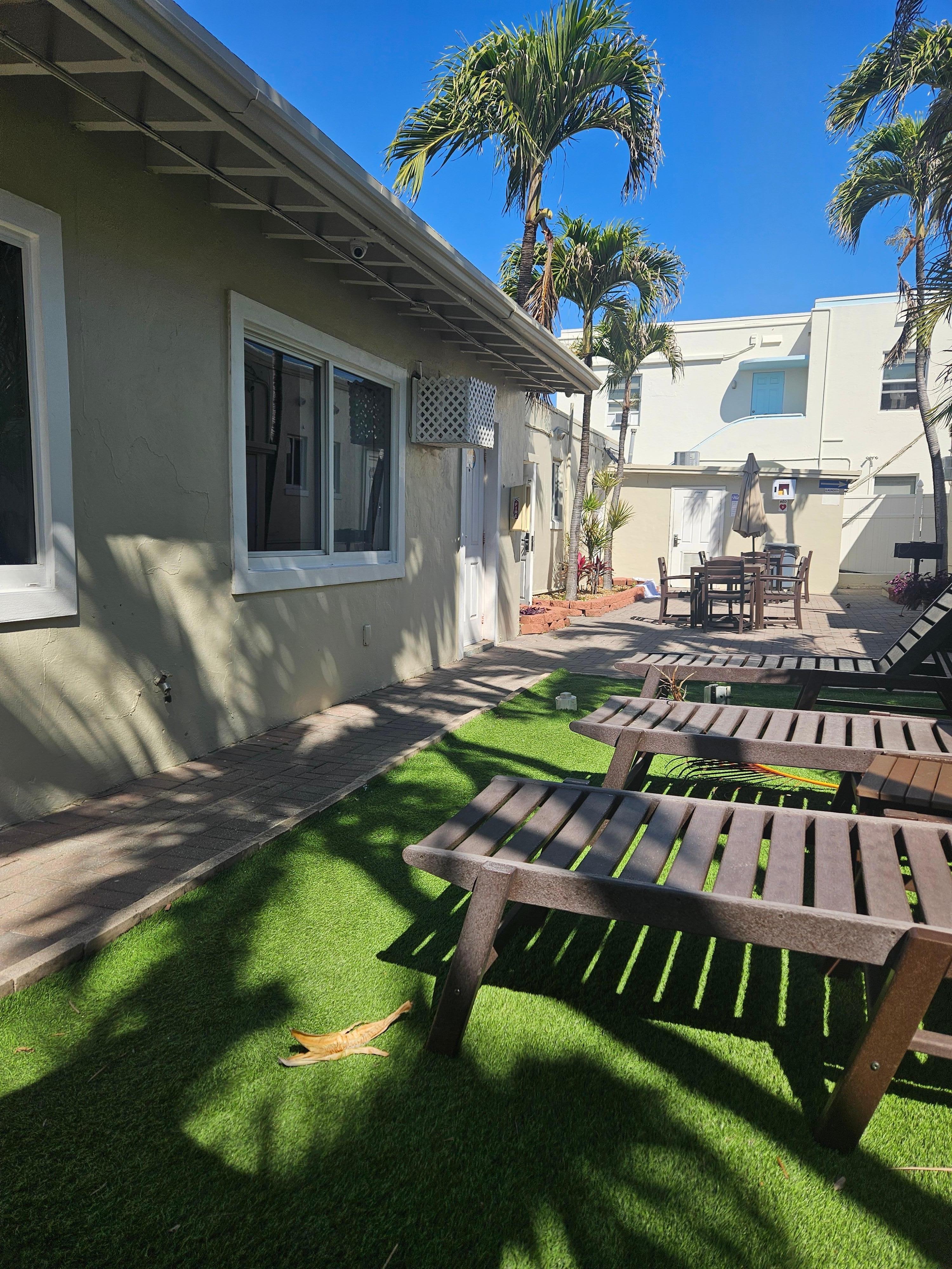 Room was average. Thin walls! You have to ask for glasses, cups, dishes etc. Court yard was nice to have. Needs a bedside table. Pullout couch was not terrible. Minimum towels provided. But location to the beach is great.