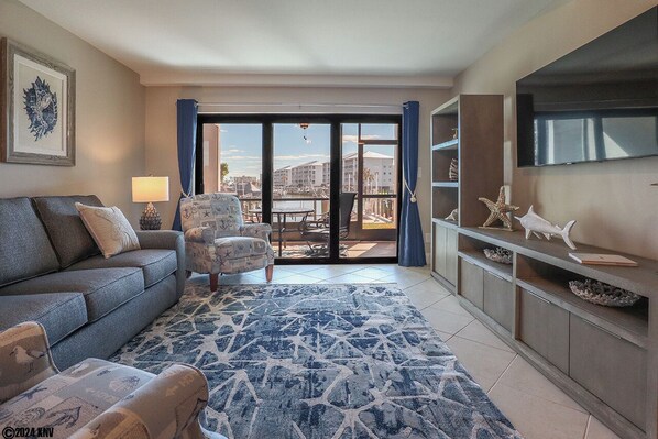This beautiful, newly furnished and updated 1 Bedroom/2 Bath Island Vacation Condo is fully air-conditioned, bright and airy with tile and wood vinyl planking floors throughout and a lovely screened in lanai with water views. The entire condo has been professionally decorated with coastal flair. Picture yourself relaxing out on your lanai watching the boats go by on their way out to the Gulf, taking in the sea breezes dining al fresco or reading a book. The gorgeous, remodeled, fully equipped Kitchen with new appliances includes that oh-so-important dishwasher. Clean and modern design features a Breakfast Bar with granite countertop providing dining for 4. There's even a special coffee station to help you start your days of fun in the sunshine. Living Room has lots of comfortable seating with a large flat screen TV. There's a sleeper sofa, providing sleeping accommodations for 2 overnight guests. Through thoughtful planning, every detail has been addressed to make this home to the perfect spot for your vacation headquarters. The spacious Bedroom En Suite has a comfortable King sized bed dressed in fresh linens and features its own TV. The gorgeous, newly remodeled En Suite Full Bath has a separate vanity and a Walk In Shower. There's a separate, second newly remodeled Full Bath with a Tub/Shower combo for Guests located in the hallway between the Living Room and the Bedroom. A FABULOUS, cozy island condo for 4!
