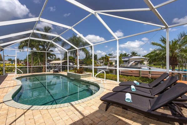 Las puertas de vidrio del patio con múltiples toboganes se abren a una hermosa área de lanai filtrada donde puede relajarse en la increíble piscina climatizada con una cascada con vista al canal. La cocina totalmente equipada incluye todos los electrodomésticos de acero inoxidable, encimeras de granito y una gran barra de desayuno. El muelle privado y el canal directo del golfo dan acceso al río Caloosahatchee en barco en solo 5 minutos. Si elige alquilar un bote, puede navegar a Sanibel o las Islas Captiva por un día al sol. Si le gusta cocinar sus propias comidas, siéntase libre de pescar su propio pescado fresco en su muelle privado ubicado a solo unos pasos de la cocina.