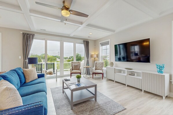 Built in late 2020, this pristine, magazine-worthy home offers high-end furnishings, deluxe amenities, and desirable comforts for the whole family. Start each day with your morning coffee out on your private, front-facing balcony complete with a bistro table and chairs. Prepare quick snacks or full-course dinners in the modern, island kitchen complete with counter seating and stainless steel appliances. Enjoy formal meals together at the dining table with seating for eight, and then meet up for movie nights in the adjacent, sunlit living area with a large, wall-mounted flatscreen TV, or in the upper-level TV lounge located at the top of the stairs - just be sure to call dibs on the cozy bean bag chair. Additionally, this vacation rental includes a furnished back deck - ideal for lazy afternoons with a refreshing drink and a good book. And for remote work or schooling, this home includes a desk and chair in the main bedroom closet. Guests will also enjoy access to a shared, seasonal pool. This unique getaway offers five comfortable bedrooms: Salt Crest (main bedroom with a king bed, and a separate room with a sitting area and office space for working from home), Salt Pond (queen size bed with its own bathroom), Salt Blue (queen size bed with its own bathroom), Salt Aire (queen size bed and shares a bathroom), and Salt Crystal (pair of twin beds and shares a bathroom).
