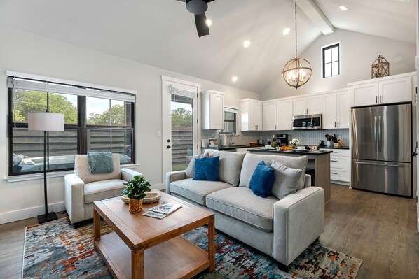 Esta casa de vacaciones con campo de golf de Fredericksburg se encuentra a menos de 2 kilómetros de Sitio histórico Fuerte Martin Scott y Das Peach Haus. Main Street y Galerías Whistle Pik también están a menos de 3 kilómetros.