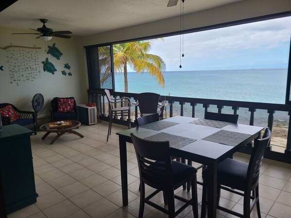 This was our first visit to St. Croix, and we hope to come back someday. Everything about our stay was even better than we had imagined. Our condo was well-equipped with everything we could need, was right on the beach, and the check-in and out process was smooth. The property manager met us upon arrival, showed us the property and amenities, and answered our questions. We didn't really need to use air conditioning because of the eastern breeze that blows this time of year. It was just wonderful having a spacious balcony that was open to the ocean breeze and sounds. We weren't able to rent a car, as none were available that week and we hadn't thought to reserve one ahead of time, but we were able to get everything we needed by walking to Frederiksted, about a mile away, and we used local taxi drivers to get over to Christiansted for a day. It felt safe to walk at night between Frederiksted and our condo, and the security system with locking gates helped, too. The snorkeling is wonderful wherever you go, from right outside the condo building to right next to the pier in town, but there's also Sandy Point Beach just on the other side of the condo--we basically had that beach to ourselves most days. It's closed during certain months for turtle migration, but we were lucky in December. The only discomfort we dealt with was some noise--due to being the week of Carnival, on several nights there was not just music, but a thudding bassline sound that made sleep a little difficult. It seemed to be coming from across the bay where the festivities were held. Noise-canceling earbuds, along with some recorded white noise, helped quite a bit. We went to the festivities and enjoyed checking out the food vendors and the traditional music and dancers in their historical attire. We also enjoyed several restaurants, our favorite being Uma's Kitchen where we had some delicious Carribean vegan cuisine. It was really a perfect vacation.