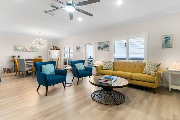 Beachfront! Relax with family and friends at Blue Pearl. This peaceful beachfront oasis sleeps 21-24 and is fully stocked to ensure a fun and comfortable stay. 10 minute beach walk to restaurants and bar. Private ramp provides easy access to the beach. Sip on your morning coffee while enjoying the breathtaking views from the balcony.