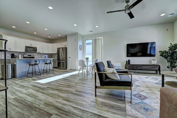 Our stay in Fruita was a joy. We arrived to find a spacious, well-maintained, sparkling clean property with all the amenities. We were especially pleased with the well-equipped kitchen -- so well-equipped that we were able to host an impromptu dinner party for some friends who coincidentally happened to be staying in Grand Junction.Our young Lab was at first nonplussed by the xeriscape yard, but was ecstatic to learn that there were nearby plots of grass maintained by the HOA. We met several locals who were also taking fur friends to visit that grass. The location is handy to funky Fruita and to larger Grand Junction; with plenty of shopping and easy access to the outdoors on the Uncompahgre Plateau. Sadly, the Colorado National Monument was shuttered by a government shutdown. Phooey. We didn't bring bicycles with us for this trip, but we noted access to both MTB trails and the Colorado Riverfront Trail (more suitable for road cycling). Although we didn't need them, I found a bike repair stand and washing gear; also provided in the game room.As a retired geologist, I was pleased to be welcomed by an array of mineral specimens in every room. It made for a touch of magic throughout the property. If we're ever in search of lodging in the GJ area again, we will definitely look into Desert Mineral Ascent again.