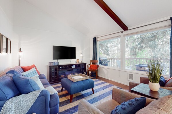 Freshly remodeled and cozy, the interior of the cabin radiates warmth. The sunny living room is a place of pure peace with its comfortable seating, large TV, and marvelous outdoor views. The adjacent well-appointed kitchen gleams with its old-school fridge and ample meal prep space. When mealtime rolls around, dine at the lovely dining table, or eat alfresco on the deck. Also in the kitchen, appreciate having access to a private washer/dryer.