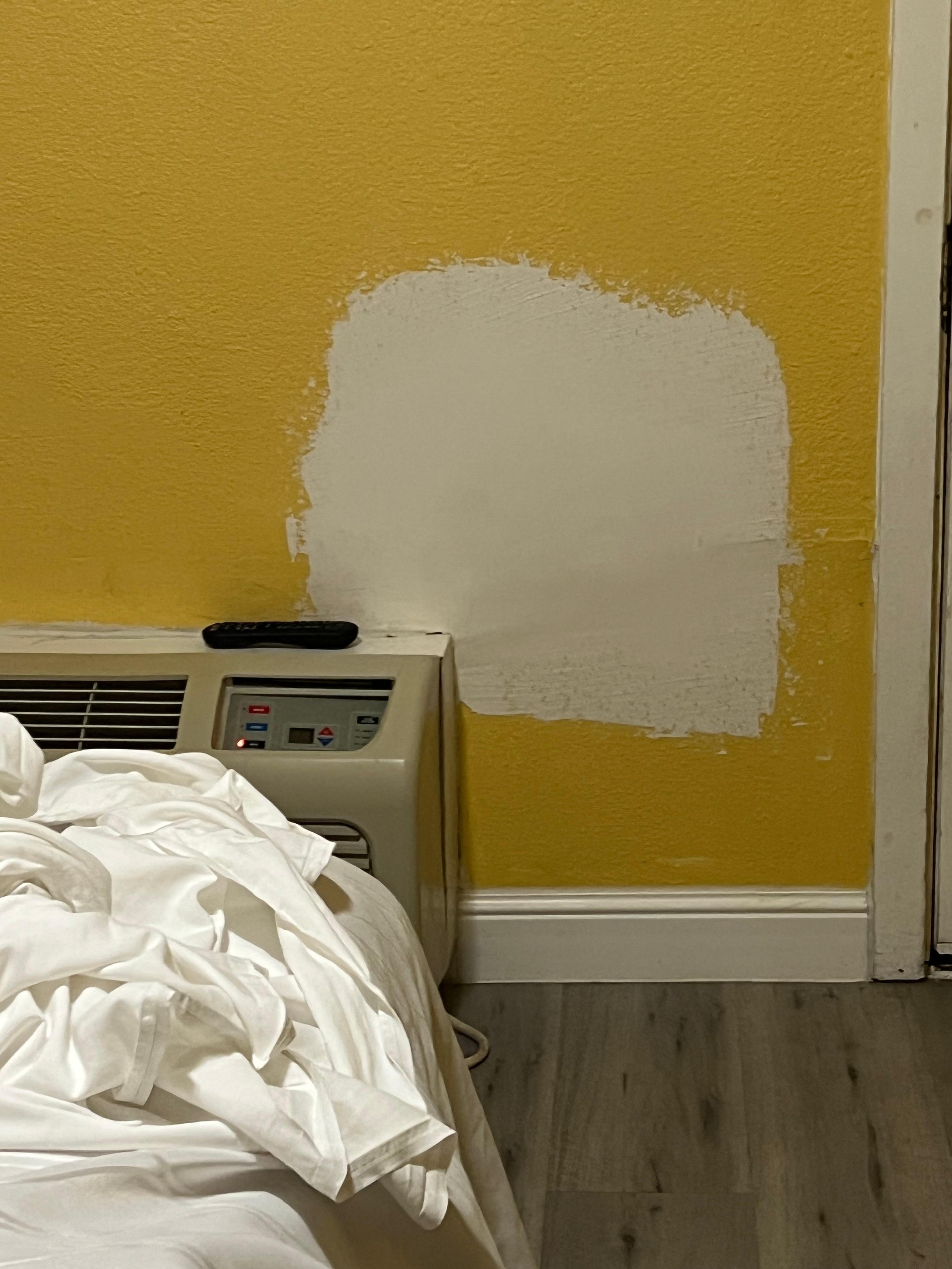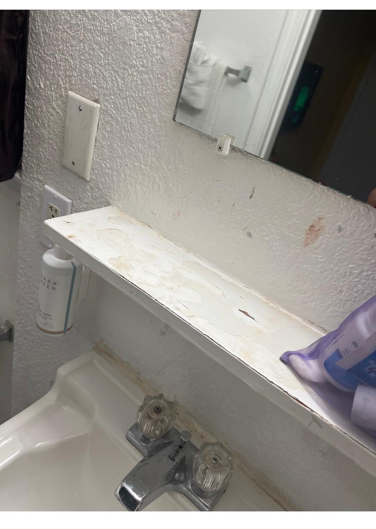 Room was clean but in ruff shape. Ragged carpet cracked and broken tile unpainted wall pateches to name a few