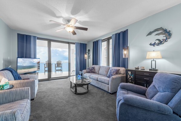Estará completamente rodeado de lujo en esta unidad completamente amueblada con muchos extras, como lavadora y secadora estándar, equipo de música completo con reproductor de CD, ¡cuatro reproductores de DVD! TV de pantalla plana en todas las habitaciones! El dormitorio principal está frente al golfo, con una cama king y su propia puerta al enorme balcón. La habitación lateral ahora tiene una nueva cama KING. El dormitorio delantero tiene dos camas individuales, y una completa para dormir cuatro en una habitación. ¡También tiene un televisor de 25 pulgadas con DVD / VCR! Cortinas opacas en todas las habitaciones para que pueda tener la oportunidad de dormir, ¿tal vez los niños también?