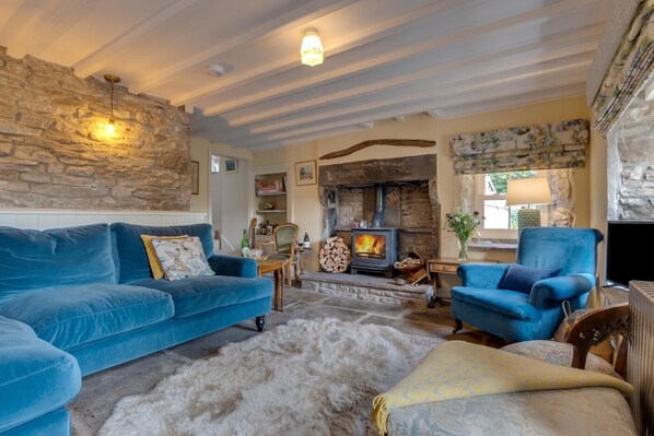 Enter this pretty stone cottage into a spacious hallway with part exposed wall, wood panelling and stone-flagged floor, where you can store your coats and walking boots. The farmhouse-style kitchen has everything you need to create culinary delights, and a handy dining table and chairs are provided so you can all eat together and plan the days ahead. Get cosy in the characterful living room where there is a warming wood burner set in a feature fireplace, and a Smart TV so you can watch films or your favourite shows. Up a few steps is a handy ground-floor shower room, as well as a bunk bed room, perfect for the children of the group. Upstairs are the further two bedrooms, both with double beds and amazing views of the countryside. A family bathroom completes the interior of the property. Outside you will find a private seating area overlooking the beck, and you will also have access to land that runs down to the riverside where you will find dining table and chairs stored in the outhouse, perfect for al fresco dining.