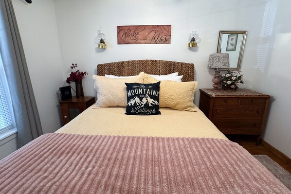 Bedrooms: 1 Queen Bedroom and 2nd bedroom has twin beds, one twin trundle (closest to window) that can be moved to stationary twin to make king, if preferred. Full bath with tub/shower.