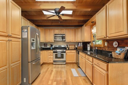 The main floor has a welcoming cabin feel, eat in kitchen and spacious beautiful living room offering a gas fireplace, comfortable couch and chair. Plenty of fabulous books and magazines and local brochures to plan out your adventures.