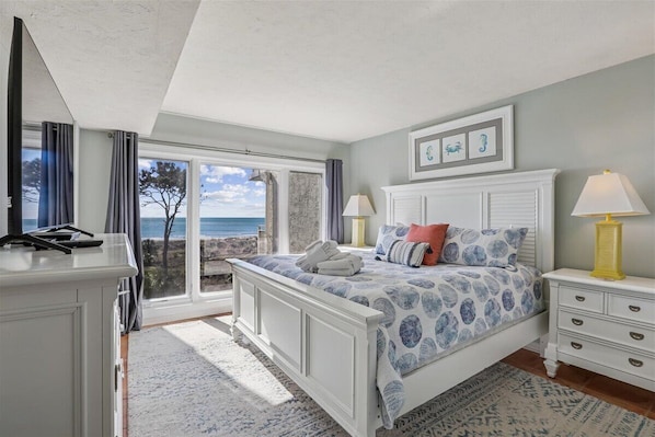 Dormitorio 1: principal, cama King, TV, baño (bañera / ducha combinada), vista al mar