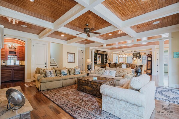 Arrive at 28 Pelican and park in the driveway or garage. Entering from the garage, you step into the open living, dining, and kitchen area with hardwood floors and a coffered ceiling. The living room features two sofas, a chair with ottoman, large coffee table, and a 55” Smart TV above the decorative fireplace. A dry bar with wine fridge sits in the corner, and doors lead to the outside deck. A half bath is conveniently located on this level. The dining area seats eight, with four bar stools at the breakfast bar. The kitchen offers granite counters, double ovens, stainless appliances, a Frigidaire Professional refrigerator, and a 5-burner gas stove. A laundry room with washer, dryer, and sink sits just behind the kitchen.