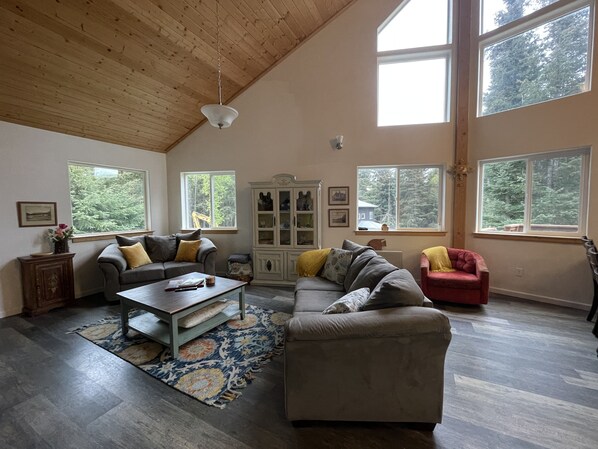 A tucked away spacious house 1-1/2 miles from town, surrounded by trees and birdsong. Enjoy Alaska's sunlight through large, south facing windows and large deck overlooking the backyard. There’s plenty of room for you to enjoy spaciousness, sunshine, peace and relaxation. The deck is a great place to enjoy the day, watching float planes fly over head and Eagles and Cranes soar above. Even though the home is conveniently located off the popular East Hill Rd, there are moose that travel through usually on a daily basis, especially in the spring. Keep your phone or camera ready! There is no shortage of photo opportunities here.