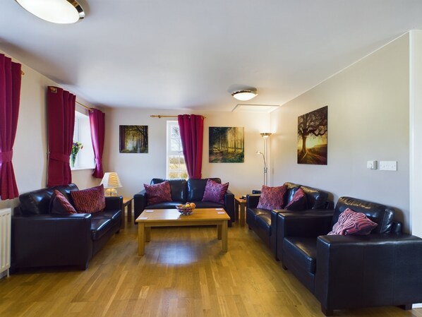 Las áreas de estar de planta abierta tienen sofás de cuero de calidad y muebles y pisos de roble real. También cuenta con un gran televisor de pantalla plana con reproductor de DVD montado en la pared y una radio DAB.