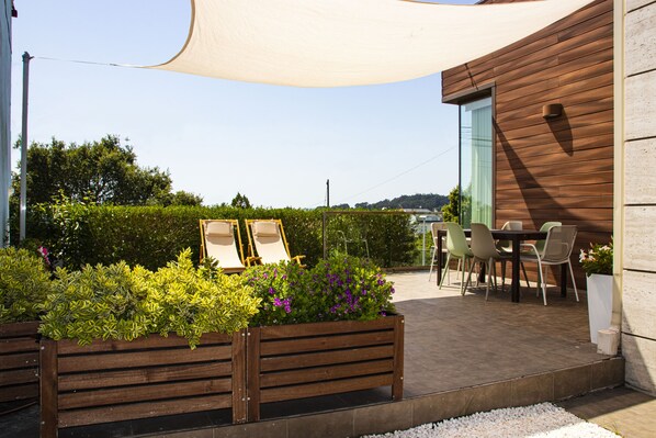 - Zona de jardín con barbacoa y comedor de exterior
