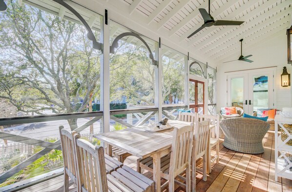 Esta encantadora casa costera se encuentra en el centro del complejo y es el lugar perfecto para sus próximas vacaciones en la playa con familiares y amigos. Este alquiler de vacaciones, a pocos pasos del hotel Boardwalk Inn y unos pocos pasos más a la hermosa playa, tiene tres dormitorios, tres baños y tiene capacidad para seis personas. Ubicado a lo largo del Gran Pabellón de calle sin salida, conduzca y descargue todo su equipo de playa en esta acogedora casa. El porche delantero está bellamente decorado con muchos asientos cómodos, que incluyen un sofá abatible. Abra la puerta principal y observe la amplia sala de estar, que cuenta con cómodos asientos envolventes y un televisor grande. Dirígete hacia la parte de atrás y cocina en la cocina abierta con una isla grande, y cena en la larga mesa de madera. Salga al porche cubierto y disfrute de una taza de café y de las tranquilas vistas de los alrededores. El dormitorio principal, luminoso y alegre, está a la derecha de la sala de estar y tiene su propio acceso privado al porche trasero. El baño principal tiene todo el espacio que necesitas para limpiarte después de un día en la playa. Otro dormitorio está a la derecha y tiene literas y acceso al baño de la sala. El tercer dormitorio, bellamente decorado, se encuentra a la izquierda de la sala de estar, está lleno de una cama tamaño king, un baño privado y mucha luz natural.