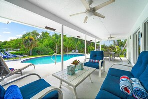 Jupiter house near beach sleeps 10 , heated enclosed pool .