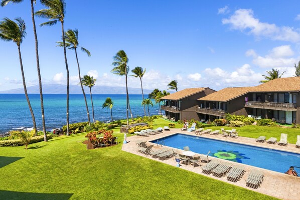 Mahina Surf es una propiedad de poca altura situada en 2 acres de hermosos jardines tropicales con impecables plantas nativas de Hawai, cocoteros y coloridas flores tropicales. Es un retroceso a la belleza del viejo Hawai y es un paraíso para los fotógrafos. El complejo cuenta con una piscina climatizada de solución salina ubicada frente al mar. Puede relajarse, disfrutar de su libro y contemplar el océano y las islas de Lanai y Molokai desde su sillón. ¡Todavía tenemos que encontrar una mejor vista de la isla de Maui!