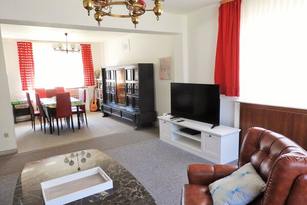 La sala de estar contigua con sofá, sillones, mesa y TV lo invita a noches de cine, noches de juegos, noches de lectura o discusiones relajadas. Encontrarás DVD con series y películas en el armario. Incluso los libros no faltan.