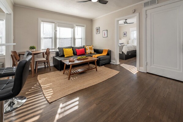 Welcome to a cozy and convenient retreat in the heart of Kansas City. With a 30-night minimum stay, this one-bedroom, one-bathroom apartment is perfect for those planning an extended visit to the city. Whether you're here for work or a long-term getaway, this space has everything you need to feel at home. The washer and dryer are located in the basement and are coin-operated.