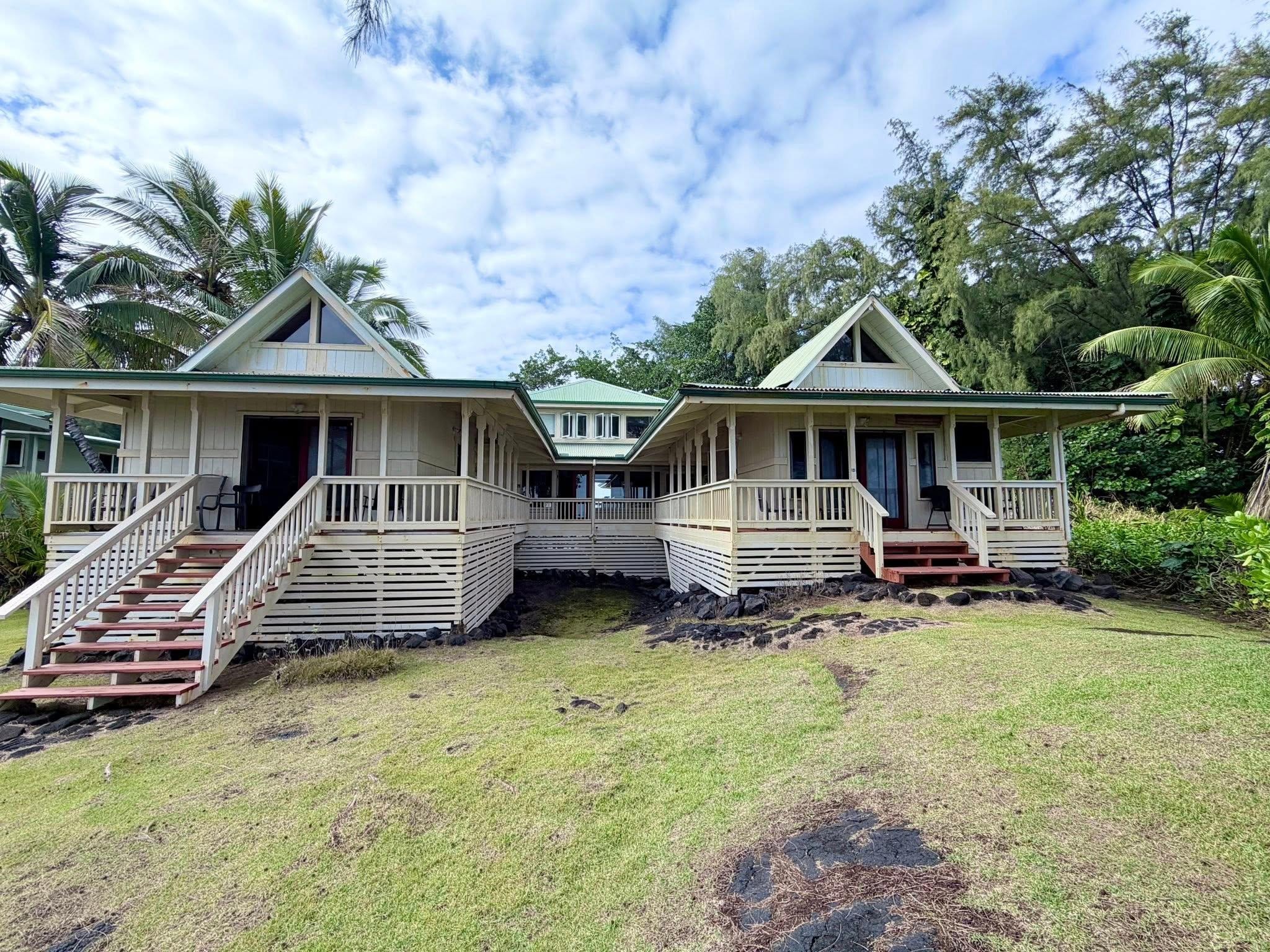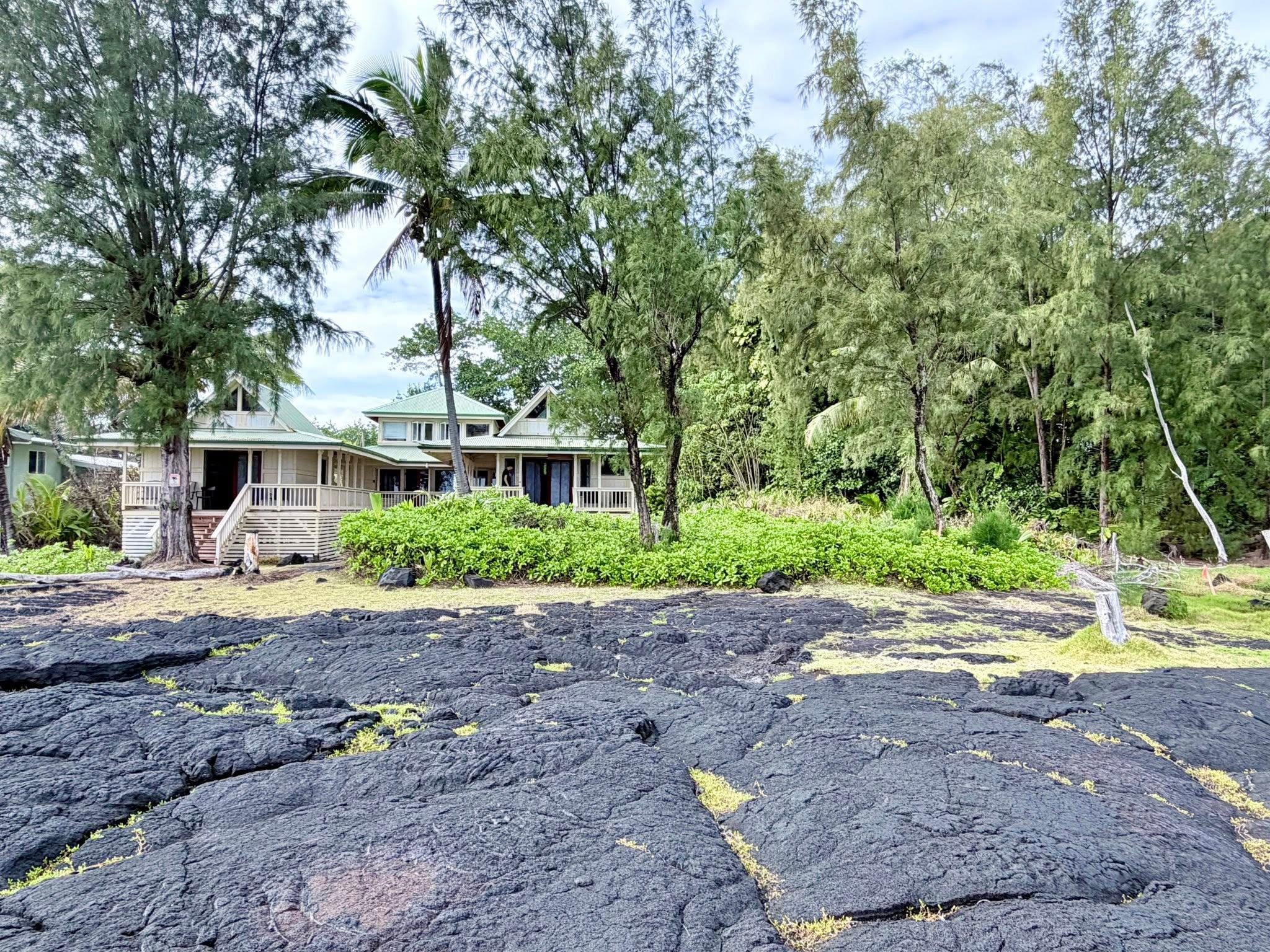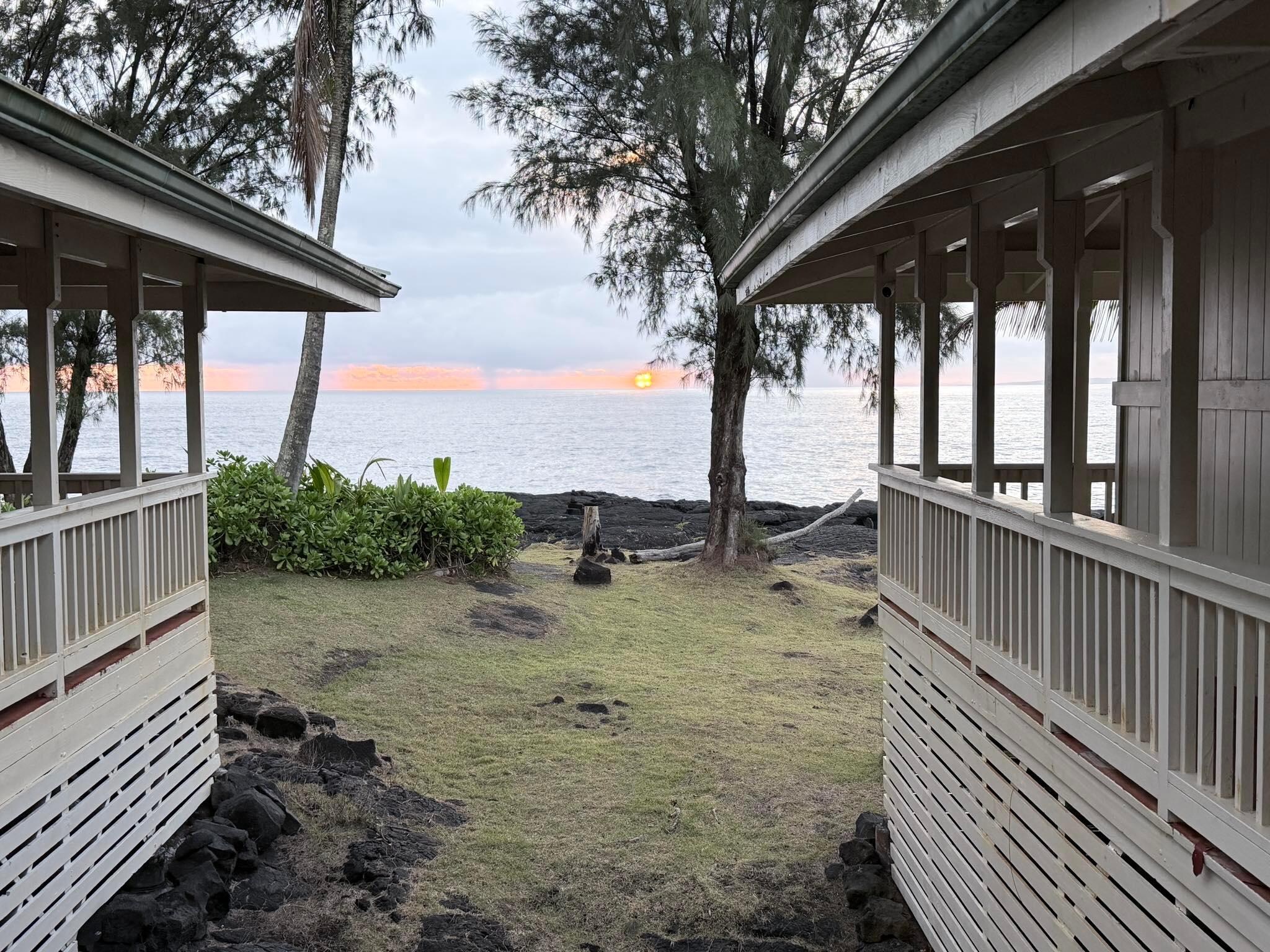 Overlooking ancient lava ocean cliffs, Temple Tree Retreat is designed to see and feel nature all around you. Our home has three main living spaces - you get the entire property to yourselves. The main area hosts the kitchen, two bedrooms, bathroom and laundry room. Another area is a bedroom/bathroom suite and the third area is a library and office space with a pull out couch bed. The three areas are connected by a covered, open lanai that serves as a cool gangway with amazing ocean views from every plank. Live the Adventurer's life, be a pirate for a week, explore this astounding island from your home port of Temple Tree Retreat.