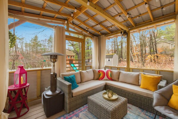 ✔ Screened-in porch with propane heater & string lights—perfect year-round