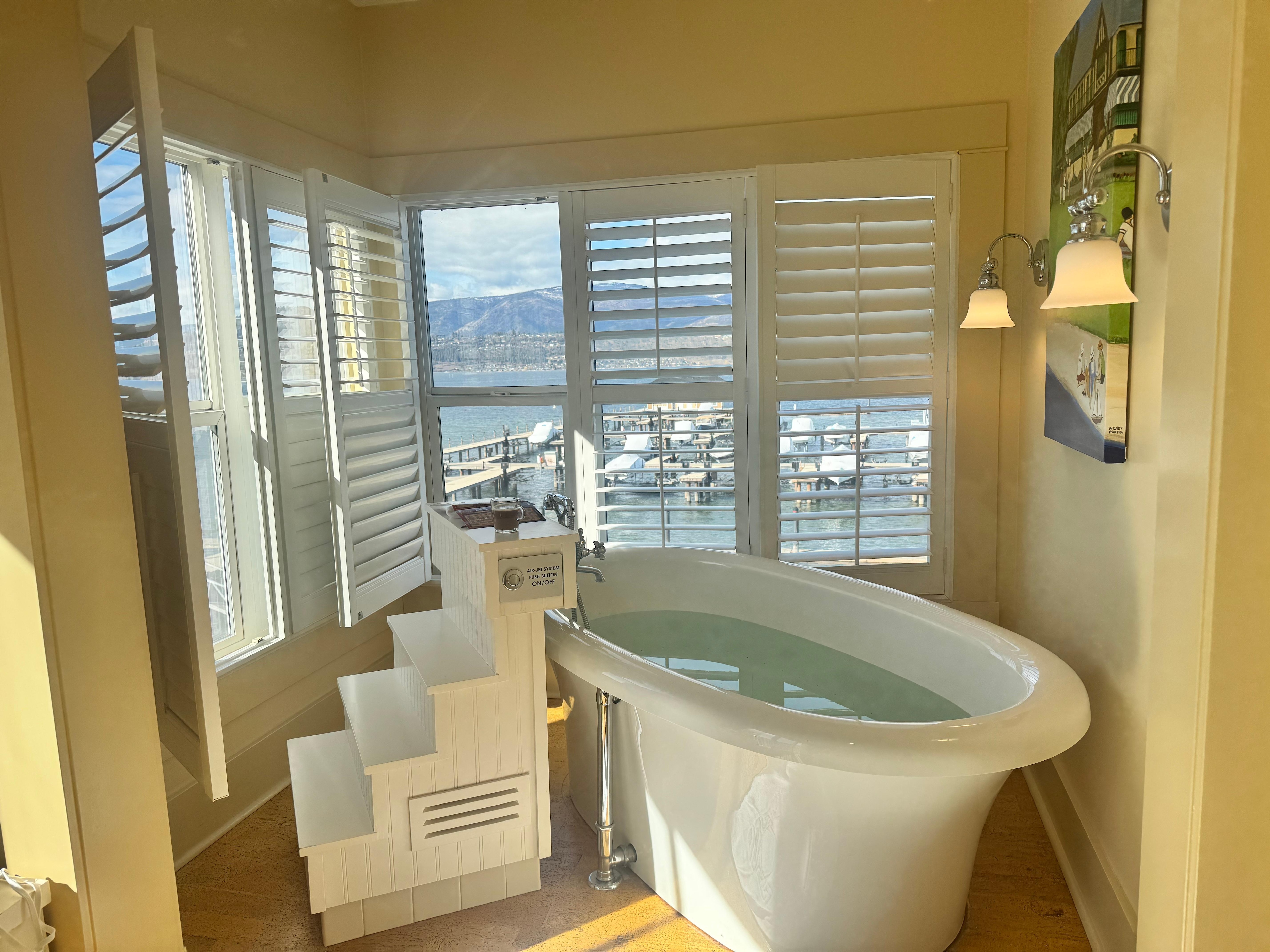 The room was lovely. The only things that would have made it a 5 star review are 1. if there was a fan or some kind of white noise option as the geese and noise from the dock outside the window was a bit loud, and 2. some access to water bottles after hours! I was surprised that there was no water available at the front desk and no vending machines in the building to purchase from. Other than that we had a lovely stay.