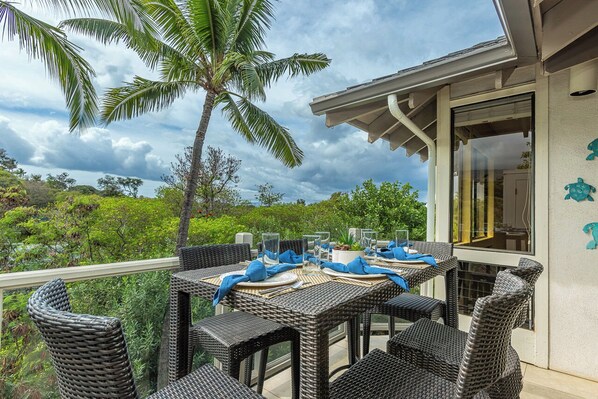 A beautiful lanai overlooking Haleakala and tennis courts
