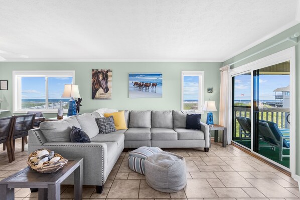 Great room cuenta con el nuevo Smart TV Sony de 55 pulgadas con muchos canales de películas y muebles acogedores para relajarse. WiFi gratuito incluido. La cocina, totalmente equipada, con vistas al océano, cuenta con capacidad para 6.
