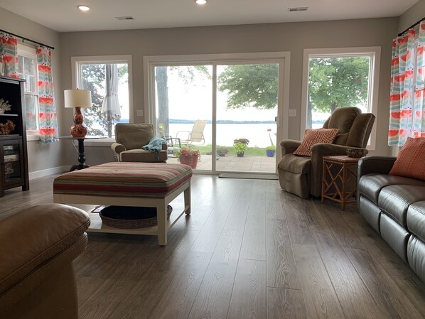 Charming Lakefront cottage with a huge NEW kitchen, living area & master suite offering over 2000 square foot of open concept living. Located directly on the lake with no roads to cross. The family area has comfy leather reclining furniture and a “lift chair” to relax and watch a movie after a day on the lake. The views of the lake and sunsets each evening are absolutely stunning. This home is all on one level and there is a concrete ramp to the patio in the back giving wheelchair access to this home plus a new concrete sidewalk to the pier. The master bathroom is equipped with grab bars and shower seat and accessible vanity.