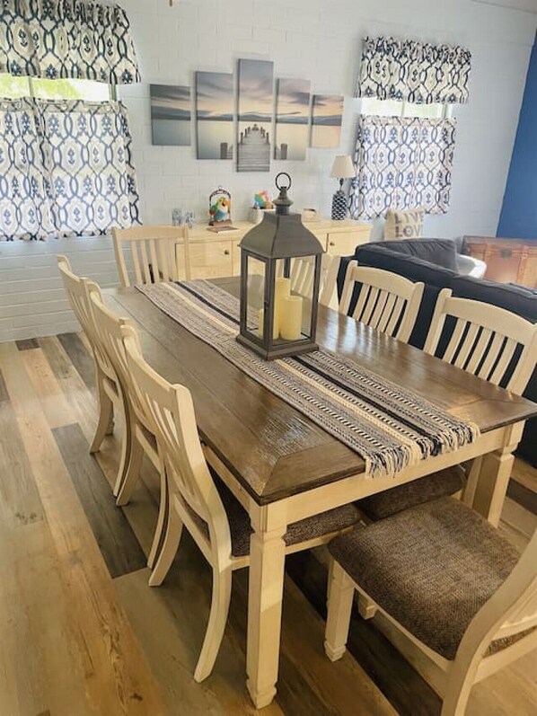 Relish at this peaceful family friendly lake front home. This heavenly decorated home allows you to escape, unwind, and allow all the worries to float away. The sense of togetherness is felt while spending time with your family during your getaway from reality. Take advantage of this updated, modern and fully stocked kitchen by whipping up a delicious meal. Living room has an open concept and will allow for an ideal family night by either having movie night or enjoying some board games. Whether it is grilling in the backyard, yard games, enjoying the fire pit with a cold beverage and radiant views of the lake from either the porch or balcony we have you covered!