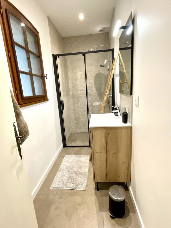 At the main level, two parental suites are available. The first bedroom has a double bed of 160 cm, wardrobes, and a bathroom with a large walk-in shower and a double sink, with direct access to the terrace. The second suite includes a double bed of 160 cm, a wardrobe, and a bathroom with a shower and washbasin. Independent toilets complete this level.