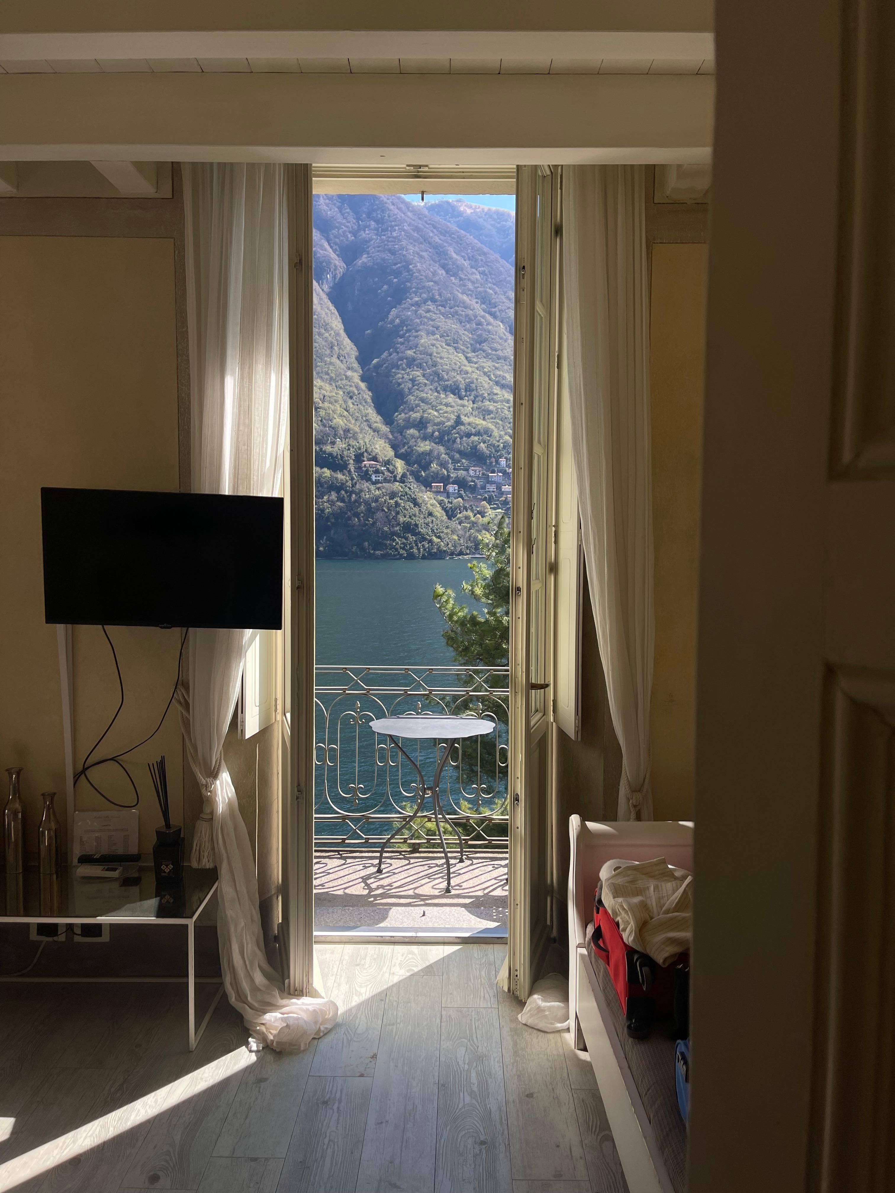 J ai grandement apprécié notre chambre avec ses volets intérieurs ses 2 fenêtres dont une avec un charmant balcon sur le lac ! Superbe