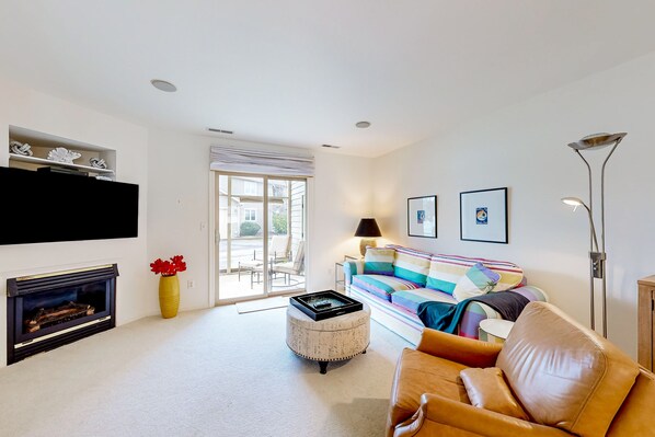The open-concept living area is tastefully decorated and has plenty of natural light. Spread out comfortably in the carpeted living area and get ready for an entertaining evening streaming your favorite show on the smart TV with streaming services. And if you are visiting during the winter months, the gas fireplace is ready to keep you nice and toasty. The living area opens onto a screened patio with seating to enjoy your morning coffee. The townhouse also boasts a fully equipped kitchen with modern appliances, perfect for preparing delicious meals.