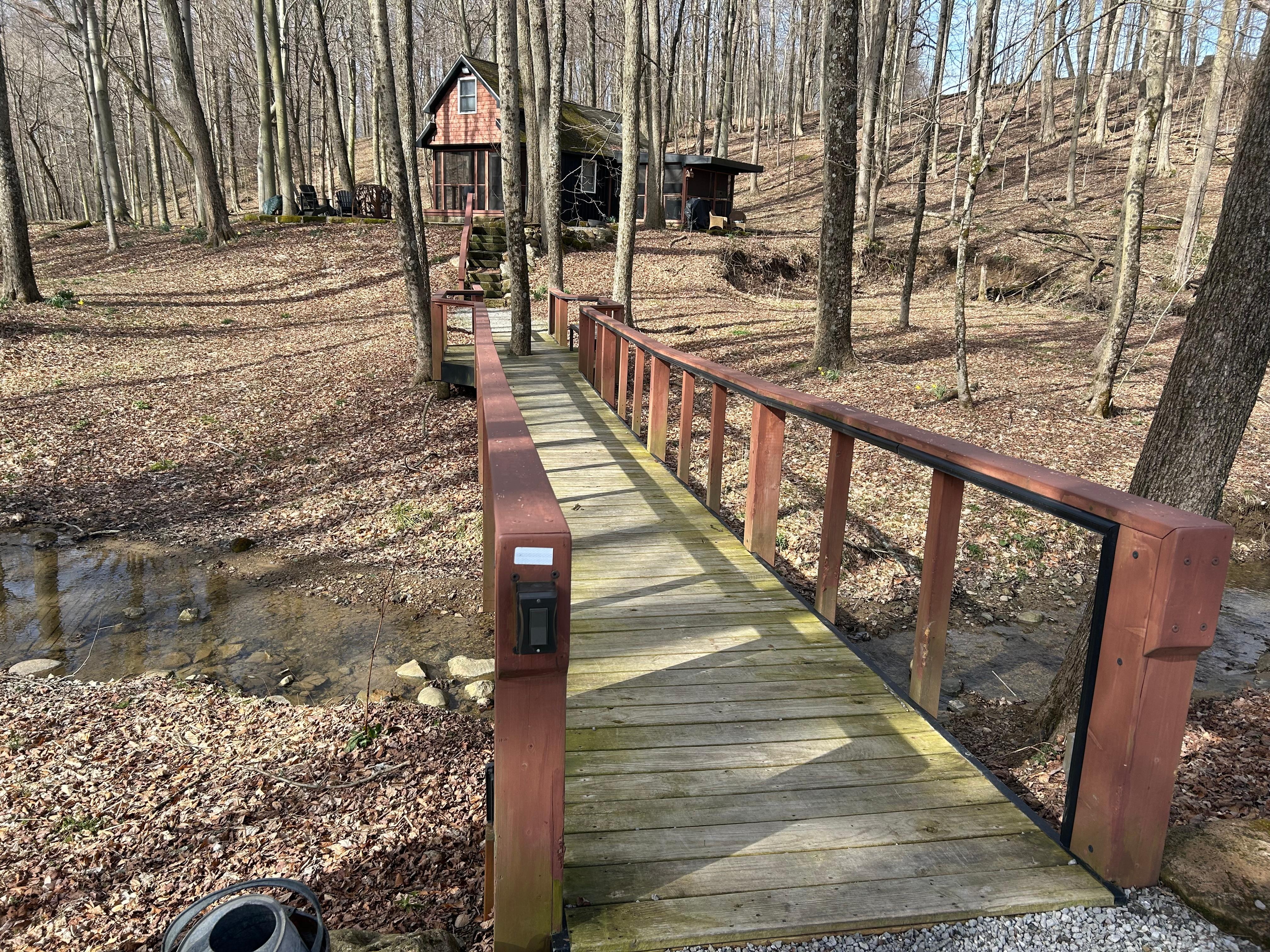 Take it easy at this unique and relaxing luxury getaway. The little cabin in the woods is a one- of -a -kind find. Craftmanship and charm in every detail. Built with reclaimed materials like the bowling alley countertops, metal roof ceilings and antique church-stained glass windows. The setting is in the country with woods, and stream with small waterfall, although easy access to major highways. The cabin has a luxury hot tub on one screened in porch with small frig and table for outdoor dining. And another screened in porch with cozy rockers for relaxing, reading a book or just taking in nature. A loft love nest bedroom with luxury queen bed, kitchen, electric fireplace, one of a kind handmade by owner firepit, beautiful bathroom with antique stain glass windows. Perfect for couples for a romantic getaway for anniversaries, newlyweds, birthdays or just a weekend away. Near Mohican State Forest, Ohio State Reformatory, Malabar Farm, Kingwood Center and Mid-Ohio Sports Car Track. All wheel Drive recommended in winter, long driveway on hill.