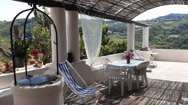 Belle maison avec une vaste terrasse ombragée,vue sur le cratère de Vulcano beau jardin fleuri.