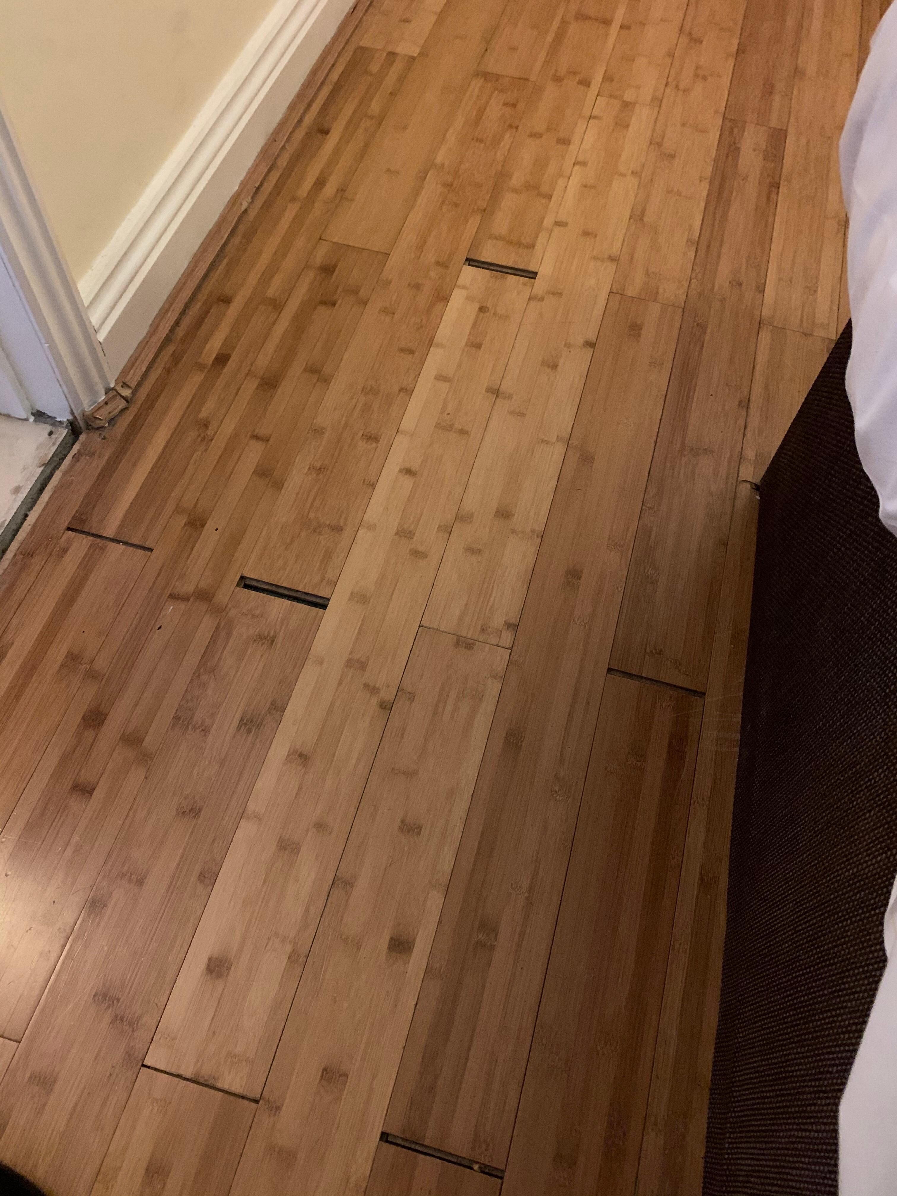 Gaps in the floor boards across the room, gap in the door frame on the floor thick with dust and nails sticking out of the floor.