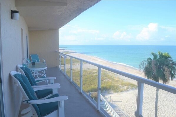 Impresionantes vistas de la playa desde el balcón orientado al oeste, con acceso desde la sala de estar y el dormitorio principal. Hay una cama King en el dormitorio principal, literas en el dormitorio de invitados y un sofá cama en la sala de estar.