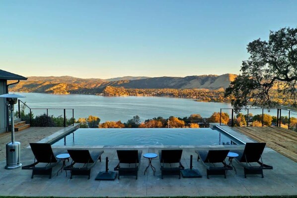Hot tub and solar-heated infinity pool (May–October)