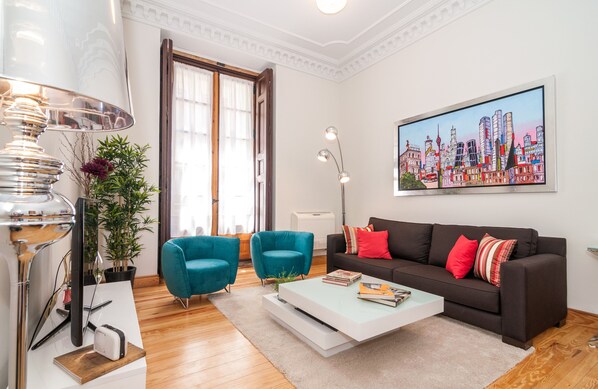 Apartamento de Lujo en la Puerta del Sol y junto a la Plaza Mayor, Palacio Real y los mejores Museos, Teatros y Comercios de la ciudad, Restaurantes, Tapas. Lógicamente perfectamente comunicado y cercano caminando a todos los lugares de interes de Madrid. Dispone de 2 dormitorios, 2 baños completos, gran Salon Comedor, Cocina, 3 balcones. Se encuentra en la segunda planta es muy luminoso. El edificio cuenta con dos ascensores. Totalmente equipado para tu comodidad con: Aire Acondicionado y Calefacción, Smart TV Movistar TV, Futbol, Formula 1, MotoGP, etc, WiFi free 100 Mb speed. El apartamento cuenta con todo lo necesario para el alojamiento de hasta 6 huespedes, ropa de cama, toalllas, vajillas, Lavavajillas, MIcroondas, Lavadora, Secadores de pelo, etc, para que te sientas tan comodo como en tu propia casa.Alquilamos este gran apartamento de 120 m2 recién reformado (Julio 2014), techos altos 4m, soleado, céntrico y con mucho encanto y lujo. Está en la calle Marques Viudo de Pontejos en plena Puerta del Sol , centro de la ciudad, a un paso de los lugares más interesantes de Madrid. Es el apartamento perfecto si estás buscando un alojamiento de calidad , económico y tranquilo en el centro de la ciudad, para sentirte como en casa. Podrás ir a pie a la mayoría de lugares de interés de Madrid.