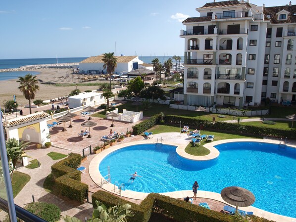 Esta deseable urbanización cerrada con seguridad las 24 horas cuenta con numerosas instalaciones, que incluyen 4 piscinas con solárium y tumbonas con vistas al mar, jardines tropicales, 2 pistas de pádel, gimnasio, biblioteca, sala de ping-pong y estacionamiento fuera de la carretera. Se ofrece acceso ilimitado a Internet y WiFi de fibra óptica gratis en el apartamento y en todas las áreas comunes, el apartamento está a solo unos metros de la playa con heladerías y chiringitos en la puerta.