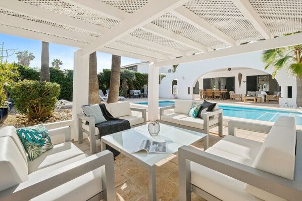 - Private outdoor pool, lit at night. Size is 8m x 4m, with 6 sunbeds and pool towels provided.