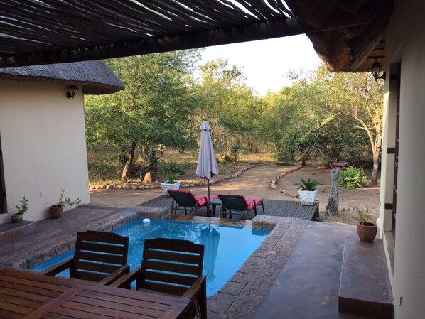 Desde la terraza se puede ver la piscina. Durante las horas de calor, los animales a menudo se quedan callados, pero especialmente en la mañana y en la noche se puede ver a los animales más diferentes que vienen a beber.