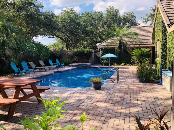 Our favorite place is the private backyard patio and pool area. Settle in for conversation or naps on the outdoor furniture. Various lounge chairs plus a large patio table with chairs and a BBQ grill provides space for dining outside.