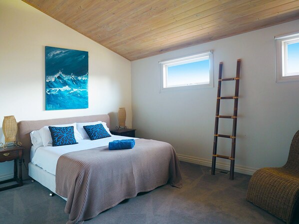 Esta casa de playa espaciosa, de dos pisos y con aire acondicionado, consta de 4 habitaciones y capacidad para 10 personas. Arriba, dormitorio principal con cama King, WIR y baño privado. Segundo dormitorio con cama de matrimonio. Tercer dormitorio con cama de matrimonio y cama individual extraíble. Cuarto dormitorio con cama doble y litera individual. Ropa de cama incluida.