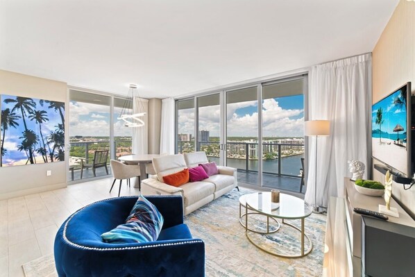 The living room offers a modern and welcoming atmosphere with stylish furnishings, cozy seating, and floor-to-ceiling windows. It opens directly onto a private balcony with beautiful city and water views.