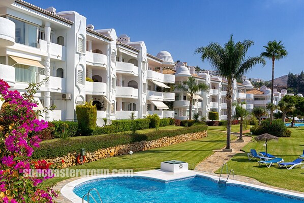 The property is in Sitio de Calahonda and in a lovely gated location. The apartment is on the top floor and was lovely and clean. It features 3 double bedrooms with airco and a good sized lounge with a picture window with an amazing South facing sea view.The property has all mod cons and catered for all our needs. It could have done however with some more glasses and small plates.Everything worked fine and there is a smart TV and a good internet connection.It's located in a hilly location. Walking down to the restaurants / pubs in Calahonda takes about 30 minutes (downhill) in a normal tempo.Back took us about 35-40 minutes and it's fairly steep in places. By car it takes about 5 minutes.The pool area is beautiful, making the most of those gorgeous sea views. The pools are a great size and had cool water, providing a much needed cooling down from the hot temperatures.The whole complex was very quiet at night and when we where there populated mainly by Spanish people and odd tourist / expat.Gardens; beautifully maintained and clean. Balcony has shade.Communication with Suncoaster was excellent.If you want to get around a bit, we would recommend a car. There is so much to see and access to the A7 is easy. Marbella is nearby and the lovely beach of Cabopino is about a 5 - 7 minute drive away.There is a LIDL also about 5 minutes away. Aqua Mijas is great. Definitely visit Mijas, Puerto Banus and Marbella.We loved our stay at this property and would recommend it!