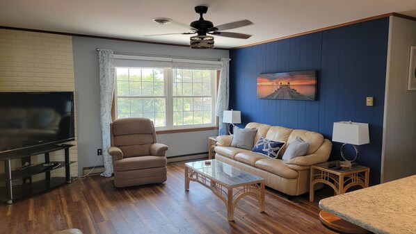 Heading upstairs, you'll find two large decks and a screened porch. The sunroom has a dining table, game shelf, and space for twin beds. In the great room, there's a cozy living area with a large TV and plenty of seating. Three bedrooms are up here: one with a bunk bed and a chair that turns into a twin, another with a queen bed, and the master with a queen bed, adjustable frame, and French doors to a private deck with bay views. There's a full bath and a half bath for convenience, and smart TVs in every bedroom for streaming your favorite shows!